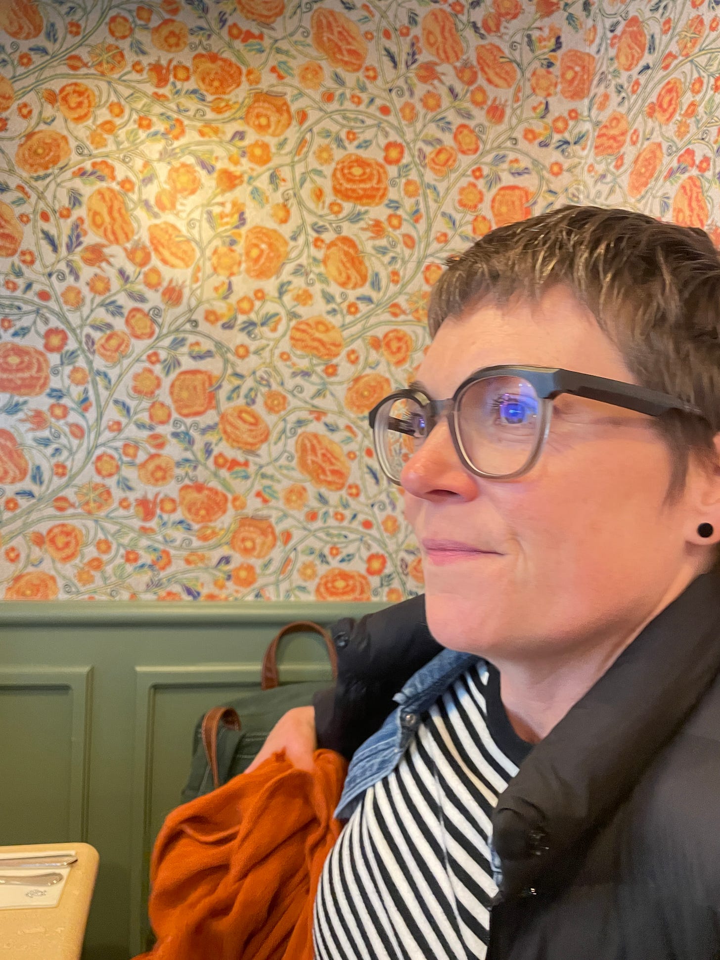 This wallpaper at a Paris crepe restaurant seized my heart. See how dense it is? See the limited palette - two oranges, one yellow, green? See how the shapes create a sense of movement and flow?